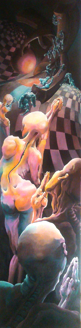 Les tentaculo-virus : inspiration spirituelle ou aspiration chtonienne ? Personnages aux attentes et postures différentes mais tous implantés dans un décor architectural ployé, limité par une coupole et, en vis-à-vis, un volume souterrain.